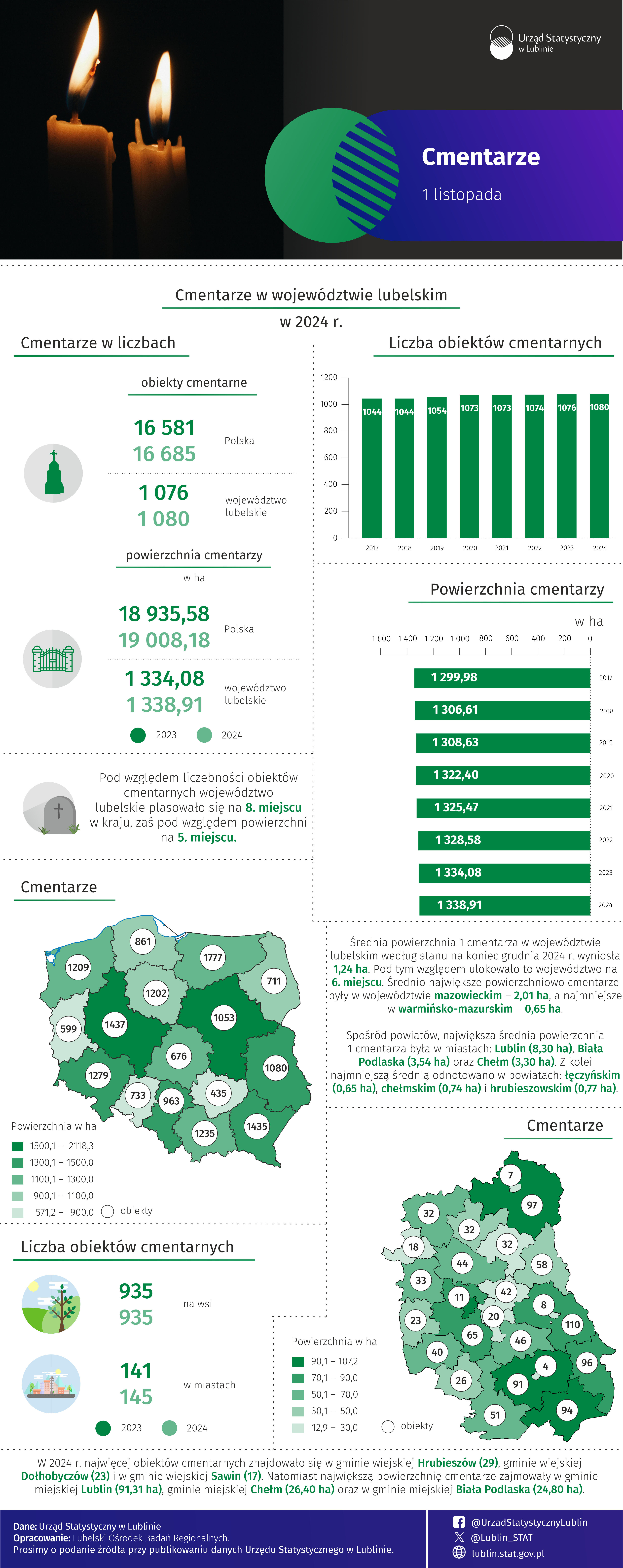 Cmentarze w województwie lubelskim. 1 listopada 2025 r. (infografika) A A A 31.10.2025 Pliki do pobrania Cmentarze w województwie lubelskim. 1 listopada 2025 r. Infografika w formacie PDF 0.52 MB Cmentarze w województwie lubelskim. 1 listopada 2025 r. Opis alternatywny infografiki w formacie DOCX 0.02 MB Archiwum 2024 Cmentarze w województwie lubelskim. 1 listopada 2024 r. (infografika) 2023 Cmentarze w województwie lubelskim. 1 listopada 2023 (infografika) 2022 Cmentarze w województwie lubelskim. Stan w dniu 31 grudnia 2021 (infografika) 2020 Cmentarze w województwie lubelskim. Stan w dniu 31 grudnia 2020 (infografika) Tagi cemntarze