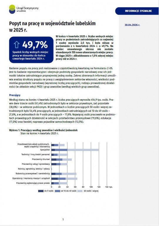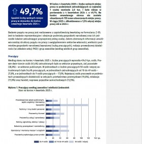 W końcu 4 kwartału 2025 r. liczba wolnych miejsc pracy w podmiotach zatrudniających co najmniej 1 osobę wyniosła 2,0 tys. i była niższa w porównaniu z 4 kwartałem 2024 r. o 49,7%. Na koniec omawianego okresu nie zostało obsadzonych 155 nowo utworzonych miejsc pracy. W ciągu 2025 r. zlikwidowano o 1,5% więcej miejsc pracy niż w 2024 r.