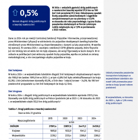 W 2024 r. wskaźnik gęstości dróg publicznych o nawierzchni twardej wyniósł 97,6 km na 100 km2 (rok wcześniej 97,2 km). Odnotowano spadek liczby pojazdów samochodowych i ciągników zarejestrowanych po raz pierwszy o 41,0% w stosunku do roku poprzedniego. Łączna liczba pasażerów obsłużonych w Porcie Lotniczym Lublin zwiększyła się o 7,9% w porównaniu z 2023 rokiem.